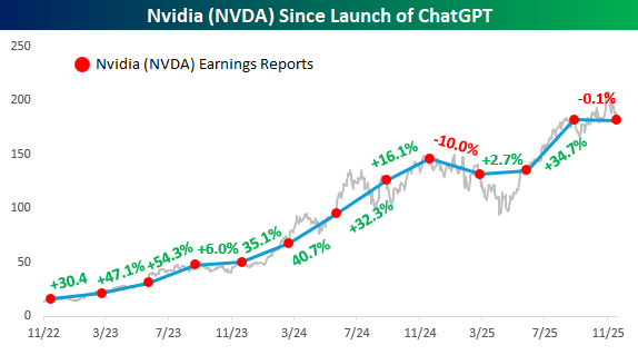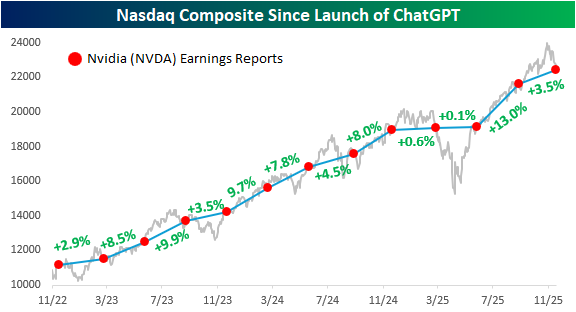The chart below from yesterday’s Chart of the Day shows the performance of Nasdaq since the launch of ChatGPT, and each red dot indicates days when Nvidia (NVDA) reported earnings. The label between each pair of dots shows how the S&P 500 performed in that span. What’s amazing about the last three years is that in every period between NVDA earnings reports, the Nasdaq has traded higher. That kind of consistency is extremely uncommon and won’t last forever.