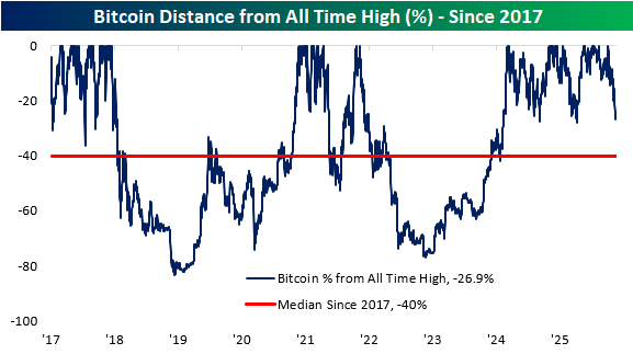 With a decline of around 27% from its recent high, Bitcoin’s decline has been contained, at least relatively speaking. The chart below shows Bitcoin’s historical drawdowns from record highs, and the current decline has been tame compared to the historical norms. Since 2017, on any given day, Bitcoin’s median decline from an all-time high has been 40%.
