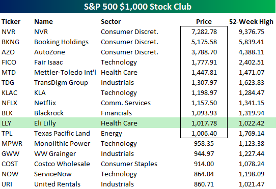 Another notable milestone was reached yesterday as the $1,000 stock price club gained another member when shares of Eli Lilly (LLY) rallied 3% to a record high of $1,017.78. At current prices, LLY is one of eleven companies in the S&P 500 with a four-digit share price, and one of 16 that have had a four-digit share price at some point in the last year. Homebuilder NVR (NVR) and travel company Booking Holdings (BKNG) both have share prices in excess of $5,000, and NVR even got within 6.3% of the five-digit club last November. Just like stock splits, share prices have no meaningful impact on the fundamentals of a company, and are more of a status symbol than anything else, but with the penny going away yesterday, we find it fitting that the $1,000 club got another member, and we only expect to see more in the years ahead. A thousand dollars isn’t what it used to be!