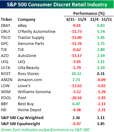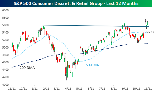 Stocks tied to the consumer have also rebounded. The table below shows the performance of stocks in the S&P 500 Consumer Discretionary and Retail Group during both the “shutdown period” and over the last week. During the shutdown period, just three of the 15 stocks in the group were up as investors avoided the group, as a large block of US consumers weren’t getting paid, and consumers overall retrenched given the uncertainty. On an average basis, they fell 5.7% compared to a gain of 2.36% for the S&P 500, which was driven higher by a handful of mega-cap names. Since Election Day, though, there has been a reversal in the performance of stocks tied to the consumer. 9 of the 15 stocks in the group have seen positive returns over the last week, and 8 of them have outperformed the S&P 500.