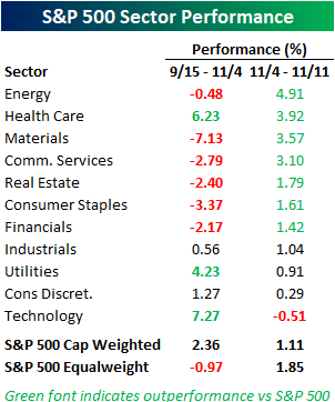 Election Day also served as a catalyst for the market to broaden out. The chart below shows sector performance from mid-September (when the odds of a shutdown on betting markets first exceeded 50%) through Election Day and then in the week since Election Day. During the shutdown period from 9/15 through 11/4, it was a narrow market rally as just three sectors outperformed the S&P 500, led higher by Technology, Health Care, and Utilities. Since Election Day, though, seven out of eleven sectors have outperformed the index as the market broadened out. As a result, the equal-weighted index has performed much better than the cap-weighted index, whereas it seriously lagged the cap-weighted index during the shutdown period.