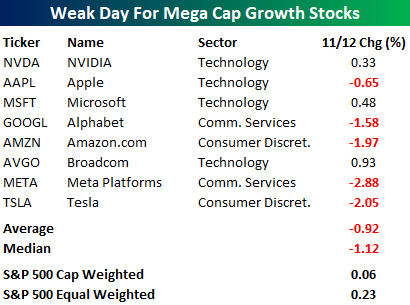 As the Dow rallied to a record high yesterday, the S&P 500 barely gained, and the Nasdaq finished down 0.26% as megacap growth stocks acted as a drag. Of the eight trillion-dollar market cap growth stocks, five finished down on the day, with four trading down over 1%. Their median decline was just over 1% compared to a gain of 0.06% for the cap-weighted S&P 500 and 0.23% for the equal-weighted index.
