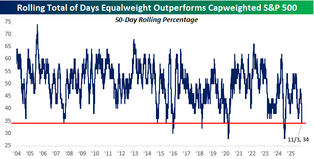 Even with the recent broadening of the market, the overall trend of the cap-weighted index outperforming has remained entrenched. The chart below shows the rolling 50-day percentage of days where the equal-weight S&P 500 outperformed the cap-weighted index. As of 11/3, the percentage dropped to 34% which was the lowest since last summer and a level that has only been breached to the downside a handful of other times in the last 20 years, with all of them occurring in the last ten years as markets have become more concentrated at the top.
