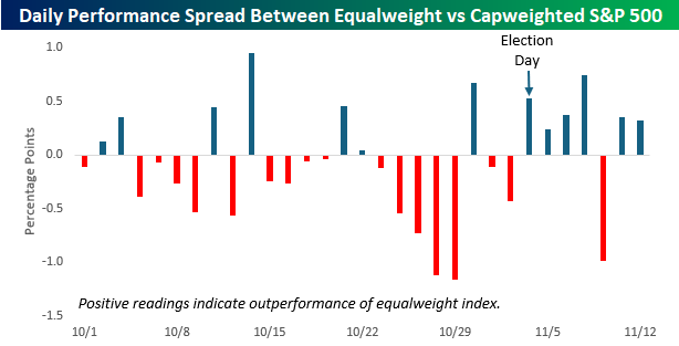 Just as the underperformance of the equal-weight index reached an extreme, though, the trend started to reverse, and so far this month, the equal-weight index has outperformed the cap-weighted index on six out of eight trading days. Since Election Day, when it became clearer that the shutdown was nearing an end, there has only been one day when the equal-weight index underperformed.