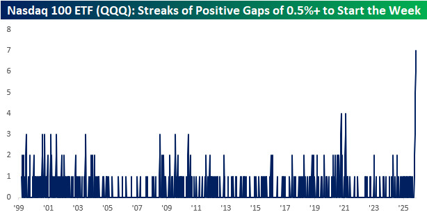 What’s even more impressive about the streak in QQQ is that every one of the positive opens has seen QQQ gap up at least 0.5% at the open. That’s the longest streak of 0.5%+ upside gaps to start a week in the ETF’s history.