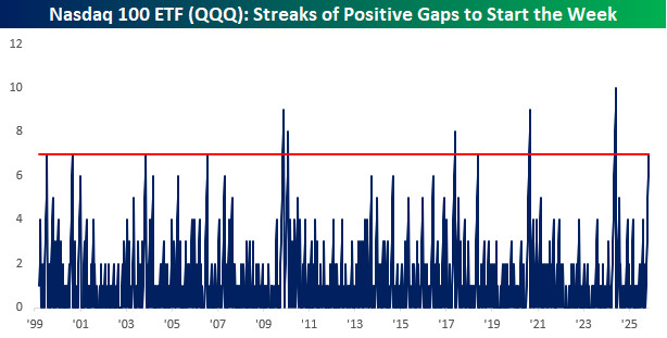 With today’s rally, both the S&P 500 and Nasdaq are on pace to gap up to start the week for the seventh straight week. That’s an impressive run and just the 15th such streak for the S&P 500 SPDR ETF (SPY) since it launched in 1993 and the 11th streak of seven or more weeks since the Nasdaq 100 ETF (QQQ) started trading in 1993. The chart below shows streaks of positive starts to the week for QQQ since it started trading in 1999, and the current streak is the longest since the 10-week record streak that ended in June of last year.