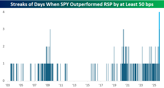 The performance gap has been so wide in the last week, that RSP has underperformed SPY by more than three percentage points. It hasn’t been just a one or two-day move either; through this afternoon, SPY is on pace to outperform RSP by at least 0.5% for the fourth straight day. Since RSP’s launch in 2003, there has never been a streak that long.