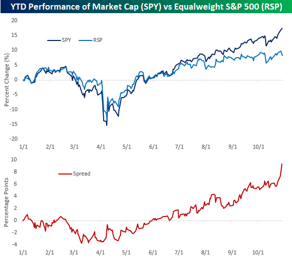 We’ve highlighted the weak breadth in the market for clients for the last several days now, and this afternoon, we wanted to provide another example to add to the growing list. Let’s start with the straight-up performance of the market-cap-weighted S&P 500 (SPY) versus its equal-weighted counterpart (RSP). For the first few months of the year, both indices performed right in line with each other. On a YTD basis, the two had equal returns as late as mid-June, but the equal-weighted index took the summer off and appears like it’s still out on vacation. As the chart below illustrates, the gap between the two indices has been widening for the last four months, with a real acceleration in the last few trading days as SPY has continued higher while RSP has traded lower.