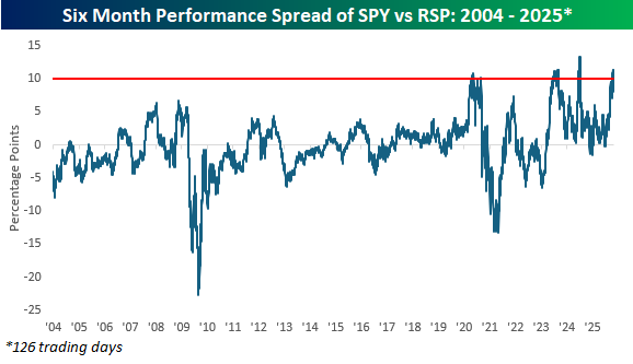 While the performance gap between SPY and RSP has been extremely wide, it hasn’t yet reached a historical extreme. The keyword here is “yet.” Over the last six months, SPY has outperformed RSP by just over 11 percentage points. This marks the fourth time that SPY has outperformed RSP by more than 10 percentage points over a six-month span. The three prior periods of massive SPY outperformance all occurred post-COVID, and the only other times the spread got wider were briefly in August 2023 and July 2024.
