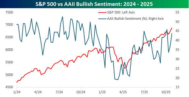 As US equities continue to march to new record highs, individual investor sentiment got a boost this week as the weekly survey from AAII showed that bullish sentiment increased from 36.9% to 44.0% for the highest reading in three weeks. While you would expect bullish sentiment to rise, current levels of optimism are nowhere near where they were at this point last year.