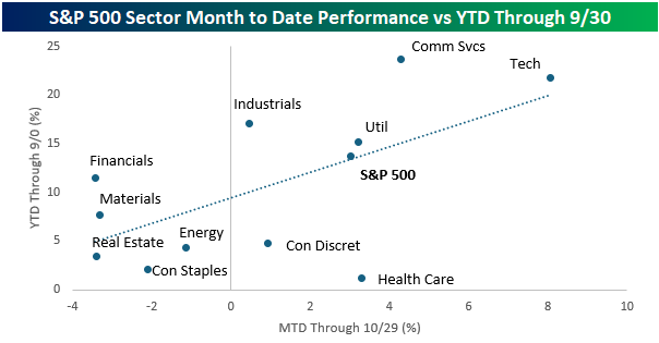 Perhaps one reason investors are less optimistic is due to the government shutdown, which has lasted nearly a month. With the S&P 500 up over 3% this month, it doesn’t appear as though the market is all that concerned, but looking at sector performance, there have been some shifts this month. The chart below compares sector performance so far in October (period covering the shutdown) on the x-axis to sector performance in the first nine months of the year (y-axis).