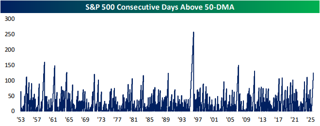 Much of the strength in SPY at the opening bell has come more recently since the tariff-tantrum. Over the last 50 trading days, SPY has gapped up at the open on more than two-thirds of trading days, and back in August, that percentage spiked up to a record high of 80%, exceeding the twin peaks of 76% from February 1997 and March 1999. What makes the current spike even more unique is the fact that it immediately followed a period of extreme selling at the open. Just as recently as this Spring, SPY gapped down on nearly two-thirds of all trading days, which was the lowest reading since December 2006.