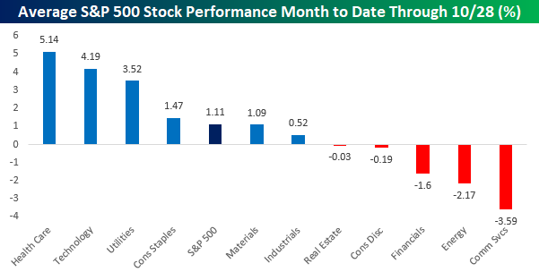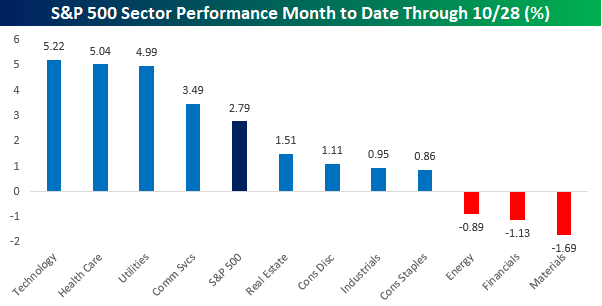 Shifting focus, with the government shutdown now set to enter its fifth week at midnight tonight, we wanted to look at how sectors have performed so far this month to see what, if any, impact it has had on performance. With a gain of 2.8% MTD through yesterday, it’s hard to say that the market has been impacted. Leading the way higher, Technology, Health Care, and Utilities have all seen gains of 5% or more, while Communication Services is the only other sector that has outperformed the S&P 500. To the downside, Materials (-1.69%), Financials (-1.13%), and Energy (-0.89%) are the only sectors to have experienced declines. It’s also worth noting that Consumer Discretionary has managed a gain of just over 1%, so even with so many Americans relying on the Federal government for either pay or benefits, and those paychecks and benefits poised to dry up, at least temporarily, it appears that the sector has held up.