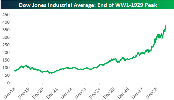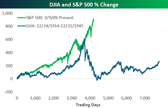 Amazingly, the S&P 500’s gains since the last big crash, the Financial Crisis, have easily eclipsed the gains seen in the Dow Jones Industrial Average during the Roaring 20s. From its low point after shutting down for four months at the onset of World War I to its peak in September 1929, the Dow gained about 616% (price only). Since March 9th, 2009 when the S&P bottomed after the Financial Crisis, the S&P is up 916%.