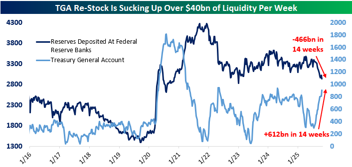 In addition to rolloff, the more acute driver right now has been the surge in the Treasury General Account. After passage of the OBBB this past summer, the debt limit was raised which allowed Treasury to rebuild its cash position (the TGA is effectively Treasury’s checking account). As shown below, it’s risen by over $600bn in the past three months.