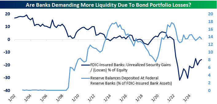 That may be in part because banks are sitting on significant paper losses in bond portfolios purchased during the COVID stimulus. As shown above, at their peak, unrealized losses were almost one-third of banking system equity capital. As rates have stopped rising and bonds have amortized, unrealized losses have declined. But in the meantime, bank treasury managers appear to be keeping holdings of reserves elevated in order to offset the risk that a need for liquid assets could force sales of bonds.