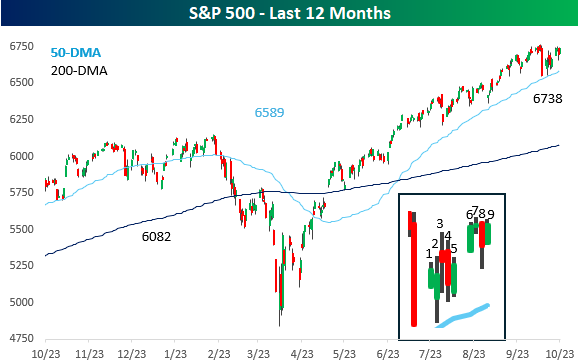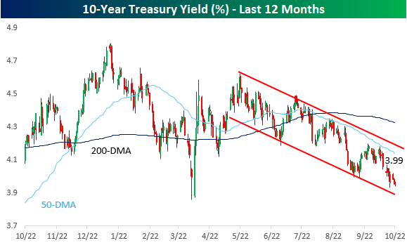 It’s been a while now, but after nine trading days bouncing around within the intraday range from 10/10, the S&P 500 is poised to test the upper end of that range at the open today. If the streak ends, it will be tied for the longest run of days trading within a prior day’s intraday range in at least 40 years. In our Chart of the Day from Tuesday, we covered these prior streaks and how the S&P 500 performed going forward, so make sure to check that out.