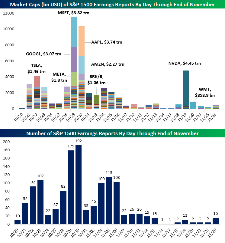 The back half of next week is when the earnings calendar will ramp back up into the peak of earnings season. Next Wednesday will have 179 reports, and the following day will have nearly 200. Included in those are another large share of mega caps: Meta (META), Alphabet (GOOGL), and Microsoft (MSFT)’s combined $9.32 trillion in market cap make reports on Wednesday help contribute to the single most impactful day of earnings. Amazon (AMZN) and Apple (AAPL) report on Thursday too, and after that Berkshire (BRK.B) will be the only other mega-cap report for another couple of weeks when NVIDIA (NVDA) and Walmart (WMT) round out earnings season in mid-November. Looking to that first week of November, although Berkshire is the only stand out in terms of market cap, the calendar is still very busy with multiple days exceeding over 100 reports from S&P 1500 members.