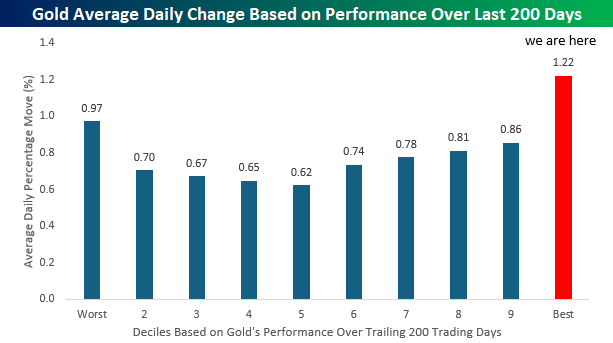 While there’s an inverse relationship between the S&P 500’s performance and volatility, for gold, it’s nearly the opposite. The chart below shows the same analysis for gold. While gold has also historically been volatile during periods when its performance has been the weakest, the strongest returns have historically come during periods when its trailing 200-day performance has been the strongest. During the strongest 200-day periods for gold since 1975, its average daily move has been +/-1.22%, or 25 basis points more than any other decile. Maybe not what you would expect, but for gold to be an uncorrelated asset, when stocks go crazy in one direction, it should go crazy in the opposite way. What makes the current period interesting is that while the S&P 500 falls into decile seven in terms of its trailing 200-day performance, gold’s performance over the last 200 trading days ranks among the best on record since 1975. In other words, they’ve actually been correlated assets so far this year!