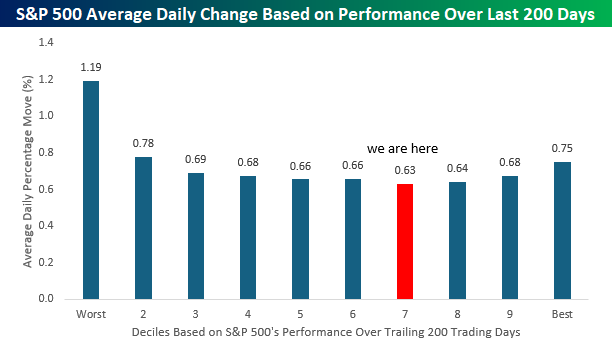 The S&P 500’s average absolute daily move during its worst 200-day trading periods was 1.19%, and just experiencing the weakness of April, that makes perfect sense. More interestingly, outside of decile one, the average daily move immediately plummets to 0.78% in decile two, and from there, it remains at or around that level (at least relative to the 1.19% level from decile one) for every decile out to ten. For the current environment, we’re currently in decile seven where the average daily move is lower than any other decile.
