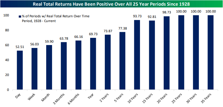 Looking for deeper insight into markets? In tonight’s Closer sent to Bespoke Institutional clients, we kick off with a look at how often real returns are positive over the long run (page 1) in addition to Apple (AAPL) breaking out to a new record (page 2). After that, we dive into the latest earnings reports (page 3) including results from Zion Bancorp (ZION) and Steel Dynamics (STLD). We then finish with a dive into the Q3 release of the Bank of Canada’s business and consumer surveys (page 4).
