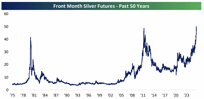 Silver futures paused their breathtaking rally today after its first trip over $50/oz since the 1980s on Friday. Year-to-date, spot silver has risen over 70%, outperforming gold’s 56% gain or bitcoin’s 19% advance, let alone the downright pedestrian 14% move in stocks.
