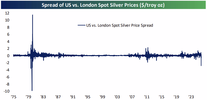 One massive driver of the move has been a physical short squeeze in the London silver market specifically. Earlier this year, US imports of silver surged with much of the bullion being sourced in London. Traders were trying to make sure they could inventory silver in the US for financial speculation and industrial uses before tariffs hit, and as a result, inventories of silver in London cratered while they surged in New York. The blistering rally in silver that has taken place since helped drive the London market into chaos as it didn’t have enough physical bullion to be delivered amidst rapid price gains. The result is an epic short squeeze, not as large as the infamous Hunt Brothers squeeze in US silver markets back in 1980 but nonetheless impressive. New York spot silver now trades at the largest discount to silver in London since the Hunt Brothers episode and the volatility that came with it.