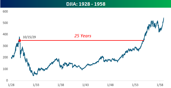 The S&P 500 closed at record highs just a week ago today, so no matter how steep the selloffs have been over time, the market has always come back. Sometimes, though, the comebacks take longer than others. After the peak this February, it only took a few months. After the 2022 peak, though, it took two years for the market to make new highs. Coming out of the Financial Crisis, it took close to five years. After the dotcom bust, it took seven years. The takeaway is that it’s all about time horizons. If you’re invested in the stock market, long periods of drawdowns shouldn’t necessarily be a baseline expectation, but they should be part of the plan. Coming out of the 1929 peak and Fisher’s comments from October 1929, those levels on the Dow wouldn’t be seen again for another 25 years! That type of drought should certainly not be a base case for investors, but it should provide some balance to a growing feeling of entitlement in some areas of the market where double-digit daily percentage gains are starting to feel like an Inalienable right.