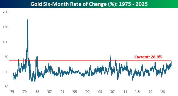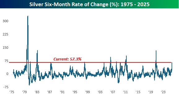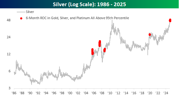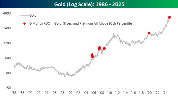 Precious metals prices have been going crazy lately. Gold’s move above $4,000/ounce last week garnered the most headlines, but its gains look pedestrian compared to other metals like silver and platinum. We’ll start with gold, though. Over the last six months, gold rallied 26.9%, and as of last week, it was up over 35% in six months. The last time it rallied that much in half a year was back in 2008.