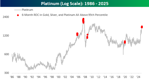 While all three metals have had widely varying rallies in the last six months, relative to their respective histories, their moves have ranked above the 95th percentile versus all other six-month periods. The charts below show the performance of gold, silver, and platinum since 1986, which is when we have pricing data for all three commodities. In each chart, we have also included red dots to show the times when all three metals simultaneously had six-month rallies that ranked in the 95th percentile or above of their respective histories.