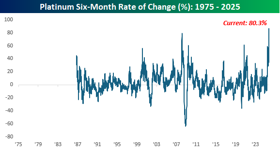 As if you think silver’s run has been impressive, platinum says “hold my beer.” Through today, platinum was up over 80% in the last six months, and as of last week, it was up over 86%. In futures pricing dating back to 1986, platinum has never had a larger six-month gain.