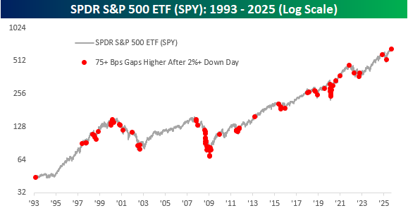 The long-term chart of SPY below shows every prior occurrence when SPY gapped up at least 75 bps after a 2%+ down day since its inception in 1993. While there were plenty of similar occurrences during the bear markets of 2000 to 2002 and 2008 into early 2009, there have also been plenty of other occurrences at various points in the market cycle.