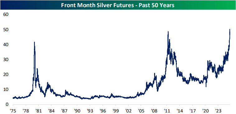 Looking for deeper insight into markets? In tonight’s Closer sent to Bespoke Institutional clients, we lead off with an overview of the interdependence of the mega-caps (page 1) followed by a check up on today’s rotation (page 2). Given a lack of official economic data, we next dive into a handful of alternative health checks on consumer spending (page 3). After that, we review food commodity prices including the new highs in beef prices (pages 4 and 5). We finish with an overview of the squeeze that has driven silver to new record highs (pages 6 and 7).