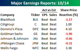 As shown in the table below, of the seven major reports this morning, all seven reported better-than-expected EPS and sales, but only three are trading higher in reaction to the reports. Domino’s (DPZ), Wells Fargo (WFC), and Citigroup (C) are all up 1% or more, while Goldman (GS) leads the declines with a drop of nearly 2%.