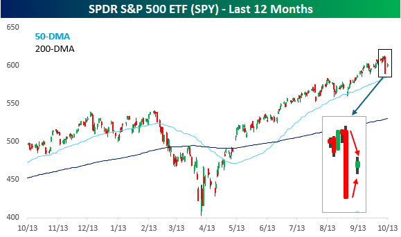 What was unique about yesterday’s trading, though, was that it was an extreme ‘inside’ day for the S&P 500 tracking ETF (SPY). An inside day in the market occurs when the intraday high for a day stalls out short of the prior session’s high, while the intraday low is higher. Not only did we have an inside day yesterday, but the intraday high was 1.3% below Friday’s high, while the intraday low was 1.1% above Friday’s low. We finished the day stuck right in the middle of the prior day’s range!