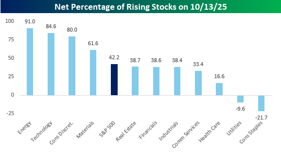 The S&P 500 had a good day to start the week yesterday, but breadth wasn’t exactly strong, especially for a day when the index rallied over 1.5%. As shown in the chart below, only four sectors saw a net of 50% or more of their components finish higher on the day. Energy and Technology led the charge with 90%+ of each sector’s components finishing higher on the day, while Consumer Discretionary (+80%) and Materials (+62%) were the only two other sectors where net breadth was stronger than the S&P 500. On the other end of the spectrum, Consumer Staples (-22%) and Utilities (-10%) both had negative net breadth, while Health Care also was relatively weak at just 17% net positive.