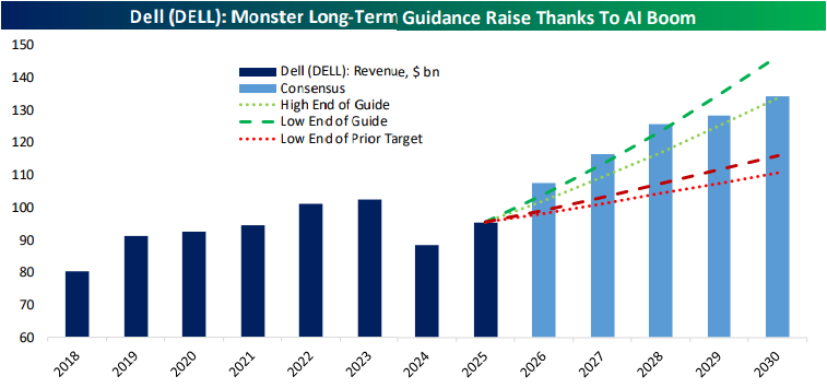 Looking for deeper insight into markets? In tonight’s Closer sent to Bespoke Institutional clients, we kick off with a look at Dell’s (DELL) AI exposure (page 1) followed by a review of the performance of quantum computing, nuclear, consumer, and travel stocks (page 2). We then switch over to investor sentiment (page 3) and next look abroad with a rundown on European auto sales (page 4). Following a recap of the latest consumer credit figures (page 5), we review the New York Fed’s Survey of Consumer Expectations (pages 6 and 7) and close out with a dive into the latest LMI report (pages 8 and 9).