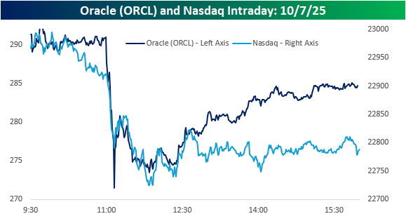 Within minutes of the story being published, ORCL shares plunged 7% and the Nasdaq traded down over 1%. As shown in the chart below, while the magnitude of their respective moves after the report was published were different, the patterns were basically identical. Within 90 minutes, though, shares of ORCL started to rebound as “sources familiar with the situation” said The Information article was off base. By the end of the day, shares had erased more than half of their initial decline, finishing the day down 2.5%. The Nasdaq, however, didn’t bounce. While the declines didn’t intensify in the afternoon, the index finished right near where it traded after the initial release of the ORCL story.