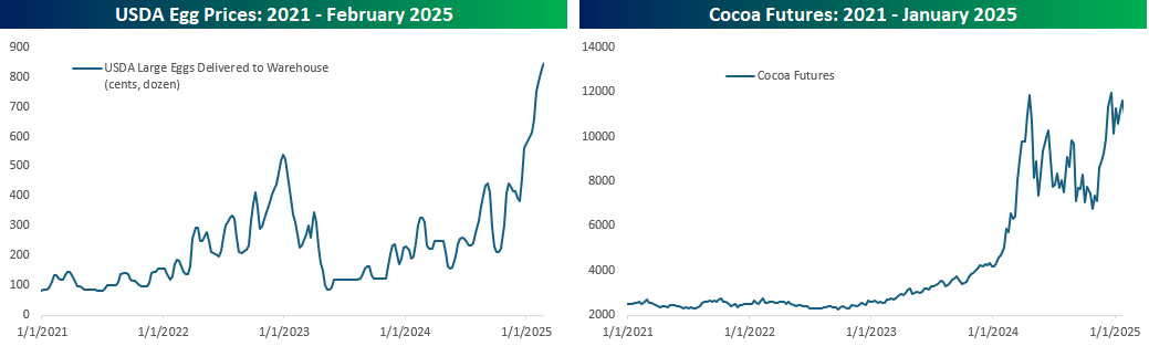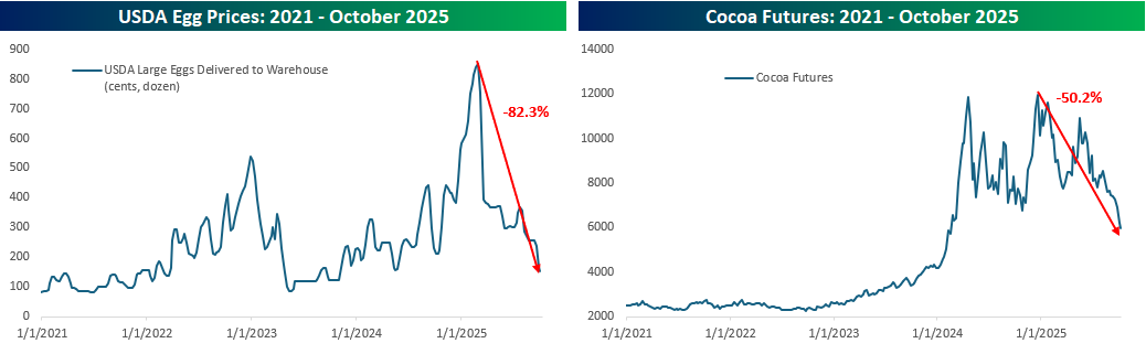 Remember earlier in the year when rising egg and chocolate prices threatened to cancel breakfast and Valentine’s Day? In the case of eggs, retailers, who could get their hands on them, even limited the number of eggs customers could purchase. Regarding chocolate, there were stories about manufacturers reducing the number of chocolate pieces or chips they included in their various products, like ice cream and cookies. The charts below illustrate the spikes in both commodities through their highs earlier in the year, and the media ran with it, extrapolating these events to warn of impending inflation spirals in the global food chain.