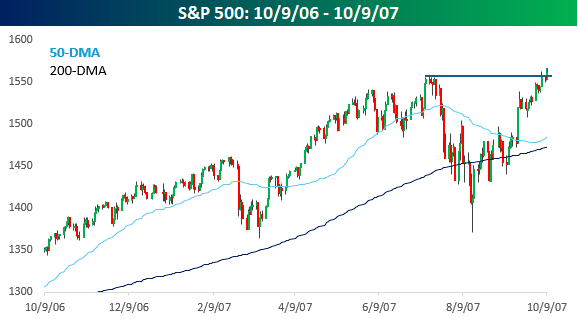 The S&P 500 closed at another all-time high yesterday, just like it did 18 years ago today on 10/9/07. That new high in 2007 followed a late-summer peak-to-trough correction of nearly 12%. It was a time of stress in the financial system as the subprime housing market was in the process of imploding, but the Fed was cutting rates, and the damage ‘appeared’ contained. From a technical perspective, the S&P 500 had traded above resistance to new highs, and the 50-DMA, which has been sloping downwards, turned higher just above its 200-DMA, which was also rising. The one caveat was that the breakout to new highs wasn’t especially convincing, as the S&P 500 had only made a marginal new high.