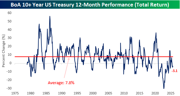 Treasury yields remain stuck in their bear market. While a decline of 3% doesn’t really seem like a big deal, we’re talking about treasuries here – traditionally referred to as a risk-free asset. Not only that, but the average 12-month return has been closer to 8%, and there have only been two months in the last five years when the trailing 12-month return was better than the long-term average.