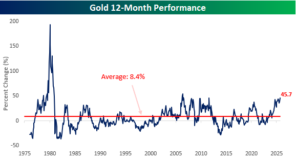 Gold is off to one of the hottest starts in decades this year, and over the last 12 months, its 45.7% gain ranks as the strongest since the mid-2000s, and the only period where there was a significantly larger 12-month gain was in the late 1970s/early 1980s.