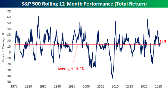 Starting with equities, the S&P 500’s total return of 15.8% over the last year is surprisingly only modestly better than the long-term average of 13.2%, ranking in just the 53rd percentile relative to history. Last year at this time, the trailing 12-month return was over 35%!
