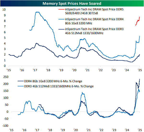 Looking for deeper insight into markets? In tonight’s Closer sent to Bespoke Institutional clients, we start out with a dive into ADP’s employment figures and a note on alternative data given the government shutdown’s effects on data releases (page 1). Next, we update the latest PMI data (page 2). Turning over to stocks, we provide some updates on performance of various baskets (page 3) in addition to a look at the surge in memory prices and related stocks (page 4). We finish tonight’s report with a look at rates (page 5).