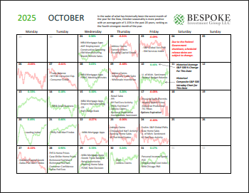 Please click the image below to view our October 2025 market calendar. This calendar includes the S&P 500’s historical average percentage change and average intraday chart pattern for each trading day during the upcoming month. It also includes market holidays and options expiration dates plus the dates of key economic indicator releases.