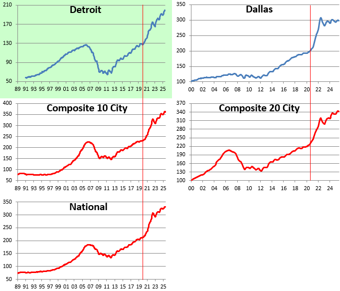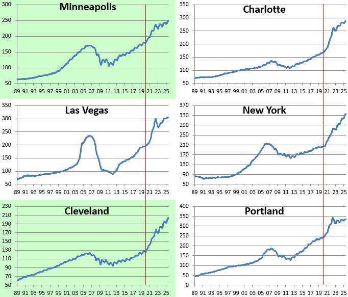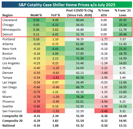 The latest S&P Case-Shiller home price data paints a clear regional divide in the U.S. housing market. Midwest cities were up on the month and remain at all-time highs (Cleveland, Chicago, Minneapolis, Detroit), while cities in the South and West continue to struggle.