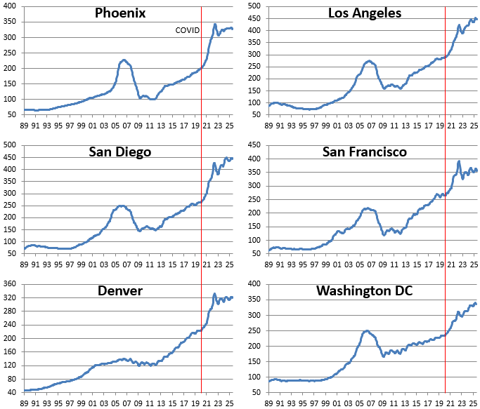 In the South and West, many metros that were pandemic-era darlings are now rolling over. Places like San Francisco, Phoenix, Seattle, Las Vegas, Tampa, and Miami all saw monthly declines and remain below all-time highs. San Francisco was down the most of any metro on the month with a drop of 0.92%, while Tampa is down the most year-over-year at -2.8%.