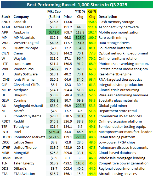Below are the 30 best performing stocks in the Russell 1,000 in Q3. There are four companies that gained more than 100% during the quarter: Sandisk (SNDK), Astera Labs (ALAB), AppLovin (APP), and MP Materials (MP). Another four gained more than 70%: Western Digital (WDC), QuantumScape (QS), Ciena (CIEN), and Wayfair (W). While there are a few names on the list of Q3’s big winners that aren’t related to AI, the AI Boom certainly made its presence felt.