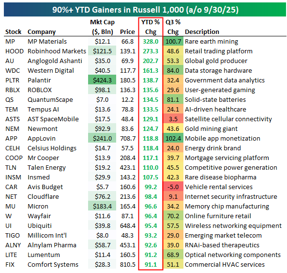 There are 24 stocks in the Russell 1,000 up 90%+ year-to-date as we close out Q3, including 15 that are up 100%+. MP Materials (MP), which gained 100% in Q3, is at the top of the leaderboard with a YTD gain of 328%. Two more stocks are up 200%+ on the year: Robinhood (HOOD) and Anglogold (AU). Western Digital (WDC) and Palantir (PLTR) round out the top five with YTD gains of 161% and 139%, respectively.
