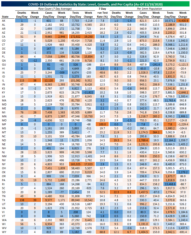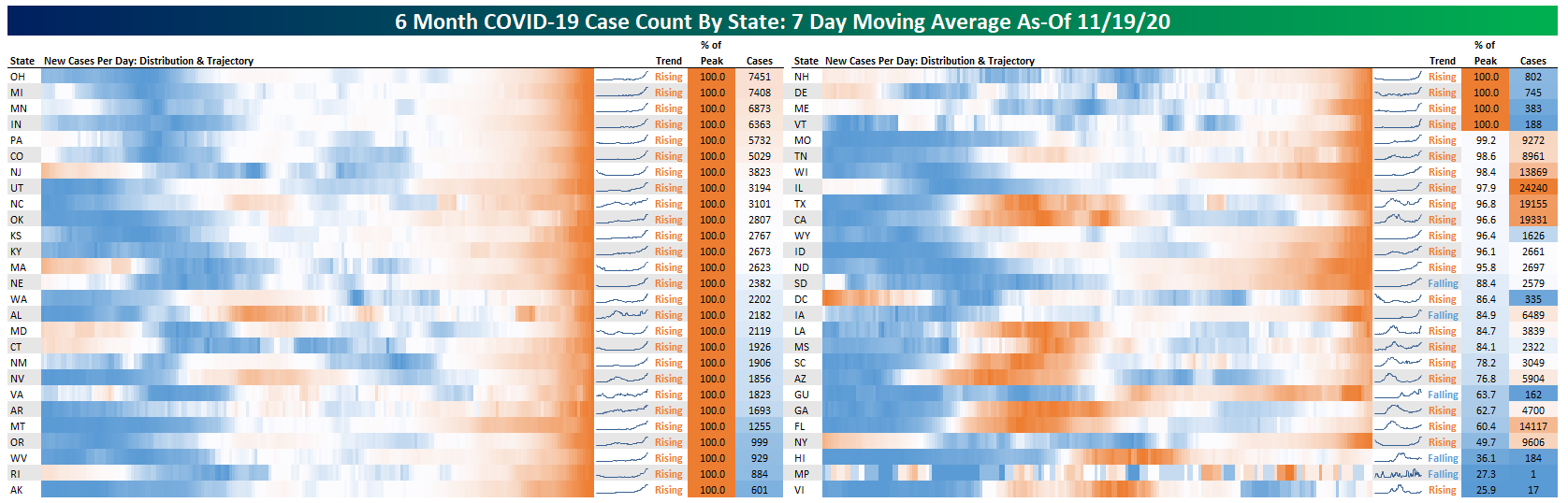Another way to look at state performance is to compare tests over time. In the table below we show state 7 day average daily positive tests indexed to their peak (which in most cases is the current level). This allows a view of where the pandemic is currently worst versus the last six months. This helps to illustrate the national breadth of this massive increase in new cases currently underway.